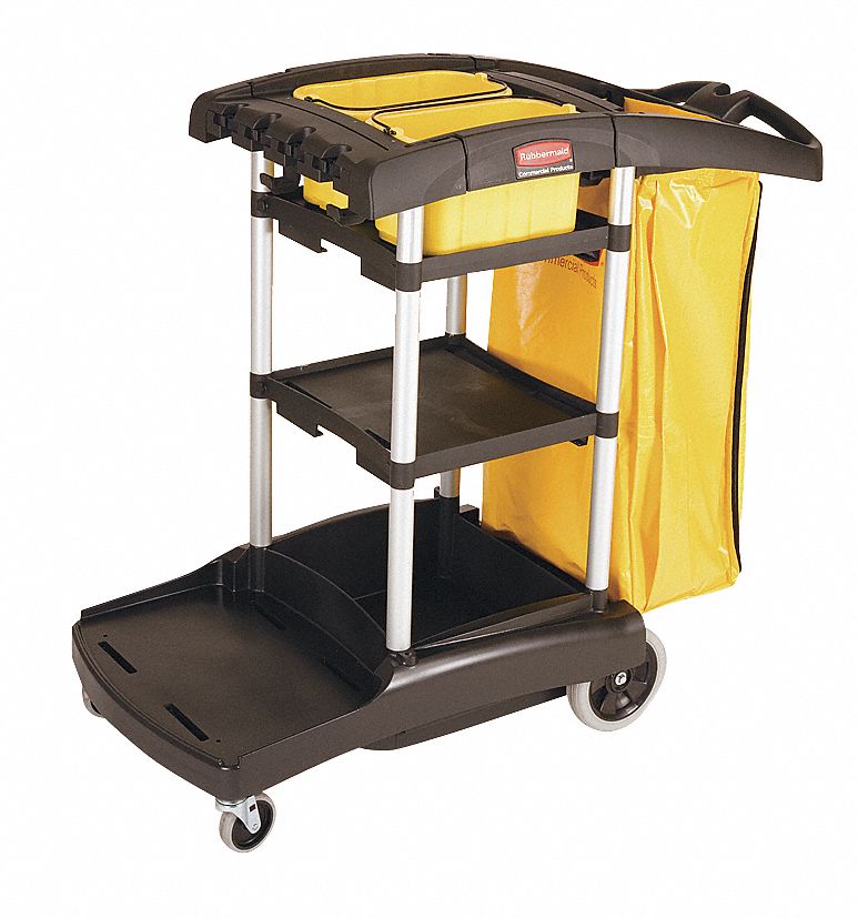 The Rubbermaid Commercial housekeeping cart with 2 caddies provides a flexible, high-capacity storage solution and tool organization. This lightweight cleaning cart has an aluminum frame with plastic shelves for corrosion resistance. Integrated handle for push-pull maneuverability through commercial doorways and onto elevators. Cart includes 5 cu.-ft. of storage plus a zippered yellow bag, 2 removable 10-qt. pails, and rubber tool grips to hold brooms, mops and other stick cart accessories upright, hooks for hanging up to 4 safety signs, and a bucket attachment that locks a wheeled bucket (sold separately) to the cart. Features 4" swivel casters and 8" wheels.
